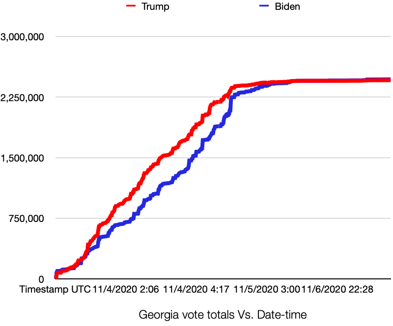 I remember looking at how results were shaping up on election night and even the morning after election night, I remember thinking – wow – this is turning out to be a landslide for Trump – Florida, Ohio, Texas and Iowa all in the bag and quickly called for him. Then I saw a broadcast from Trump election HQ saying with the president saying ‘we’re not going to let them get away with this’. Get away with what ? You’re winning ! But then, as the overnight vote counting stoppages in PA and GA and other swing states became apparent, and the day-by-day delays in calling each state ensued, it was clear that some kind of shenanigans were going on. The time series of the reported vote totals are helpful to flesh out the picture (again from the NY Times data) :